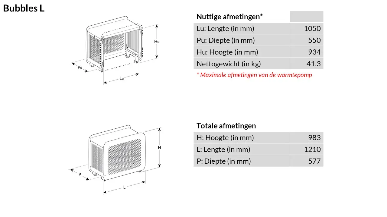 Het BUBBLES complete model wordt op de vloer geïnstalleerd, losstaand van een muur en maakt het mogelijk de warmtepomp of de airconditioning volledig af te dekken, waardoor een perfecte 360° uitstraling ontstaat.