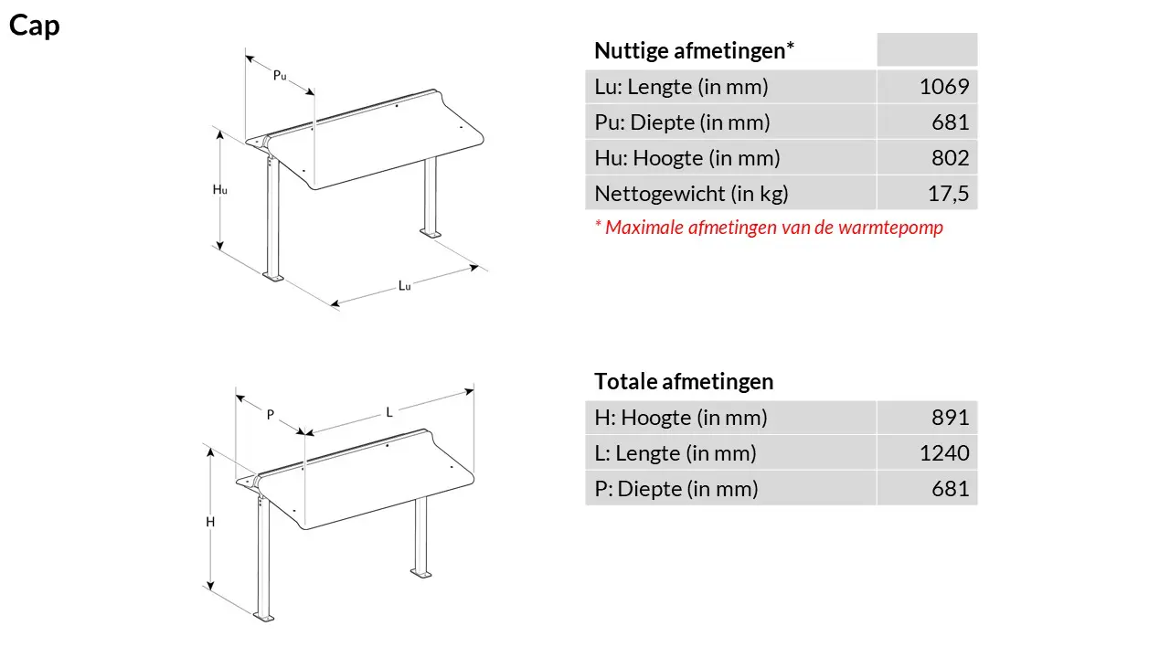 De zelfdragende CAP beschermkap (slechts één maat, B 1069 x H 802 x D 681 mm) wordt met de 2 voeten aan de grond bevestigd en beschermt de technische eenheid tegen weersomstandigheden (regen, sneeuw, UV).