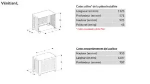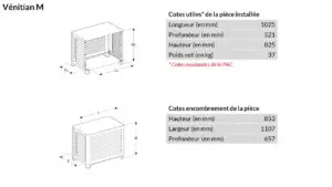 Le cache premium Outsteel VENITIAN complet est un cache intégral conçu pour dissimuler de manière esthétique et protéger son installation de pompe à chaleur ou de climatisation située à l’extérieur du logement contre les intempéries. Avec son look inspiré des stores vénitiens, Outsteel VENITIAN complet offre une circulation d’air parfaite pour un fonctionnement optimal des appareils. Il s’adapte aux configurations classiques des unités techniques (murales près du sol et au sol isolées) et à la majorité des PAC et climatisations.