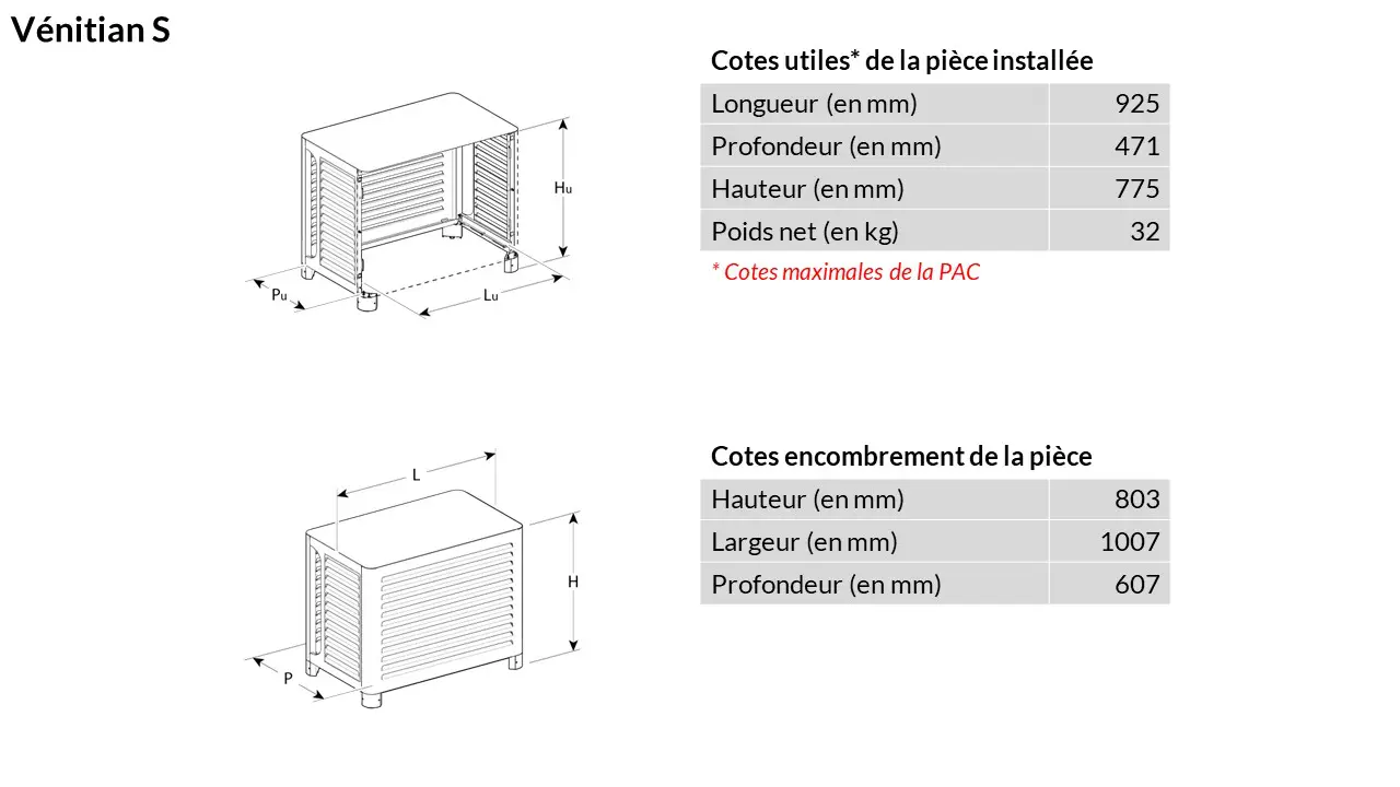 Selon l’implantation de l’unité technique (sol espacée du mur ou murale près du sol), 2 options disponibles.