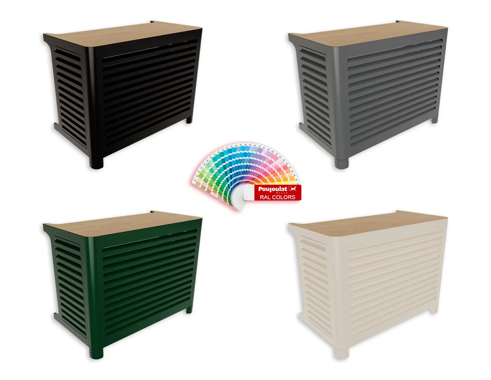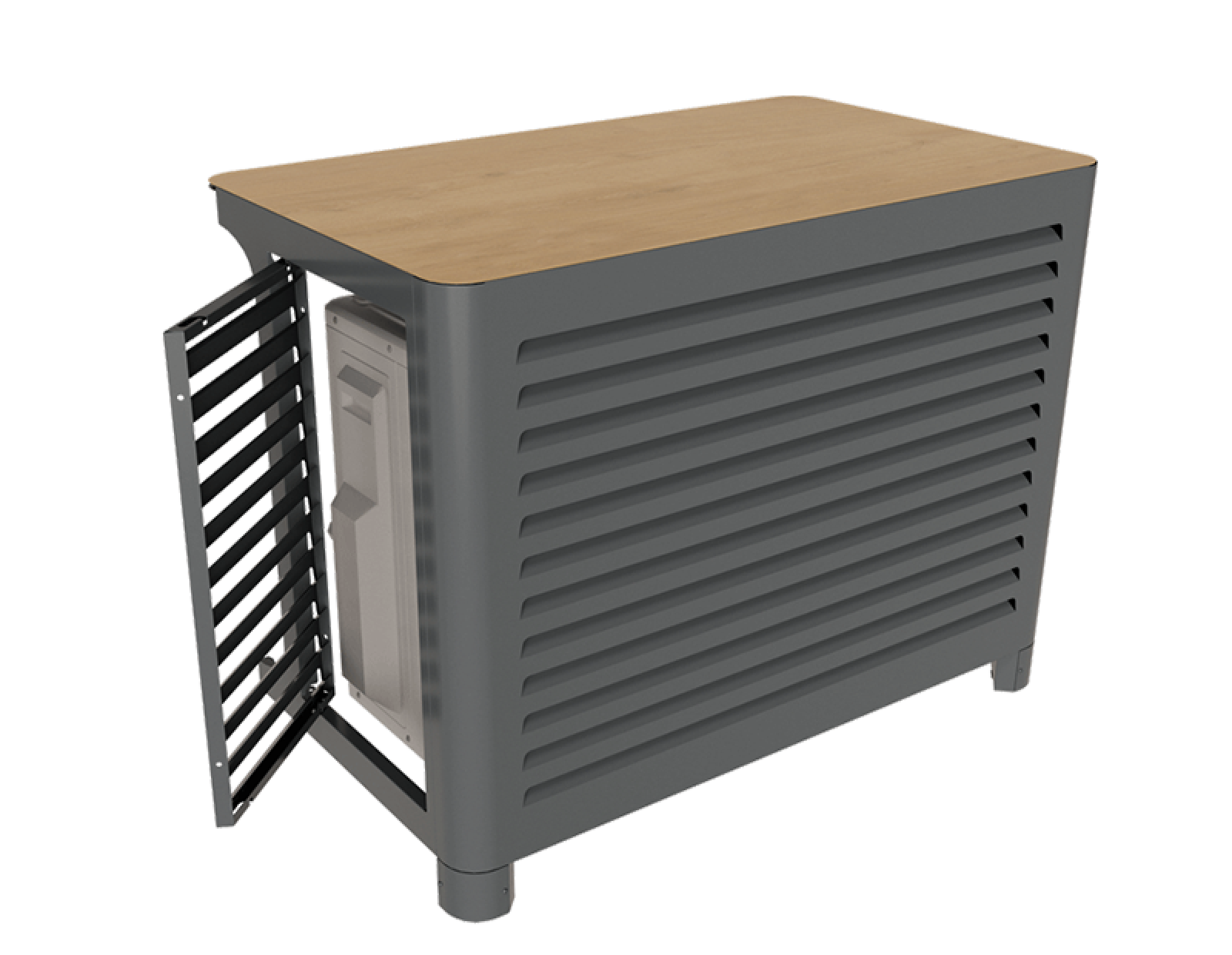 Le cache pompe à chaleur et climatisation VENITIAN présente un système d’ouverture ingénieux grâce à ses deux portes amovibles permettant un accès simple et rapide à la PAC ou à la climatisation pour toute maintenance réalisée sur le côté de la PAC. Il bénéficie également d’un élégant plateau aspect bois sur le dessus de l’habillage pour accueillir les décorations extérieures jusqu’à 15kg.