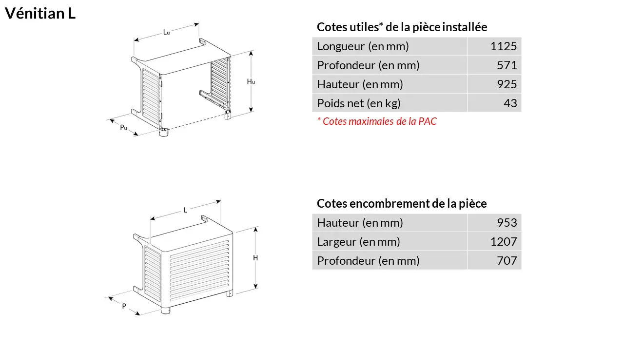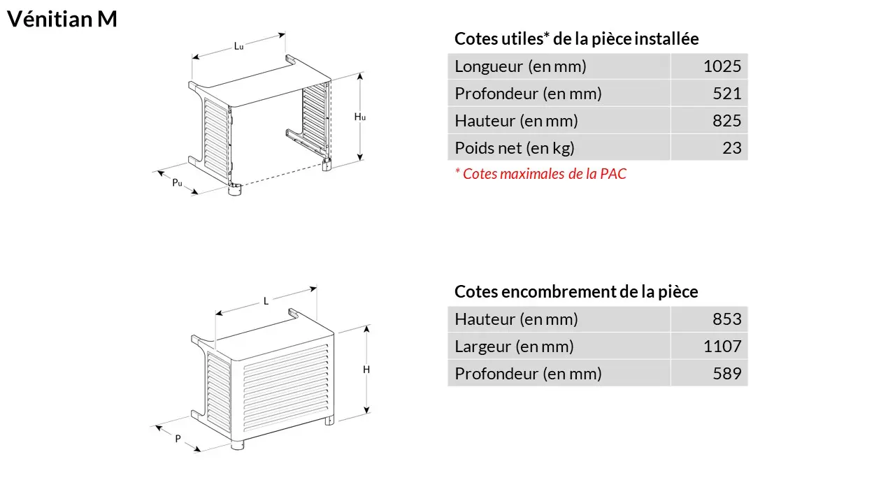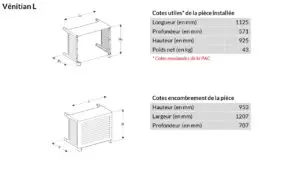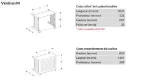 Le cache premium VENITIAN est un cache intégral conçu pour dissimuler de manière esthétique et protéger son installation de pompe à chaleur ou de climatisation située à l’extérieur du logement contre les intempéries. Avec son look inspiré des stores vénitiens, VENITIAN offre une circulation d’air parfaite pour un fonctionnement optimal des appareils. Il s’adapte aux configurations classiques des unités techniques (murales près du sol et au sol isolées) et à la majorité des PAC et climatisations.